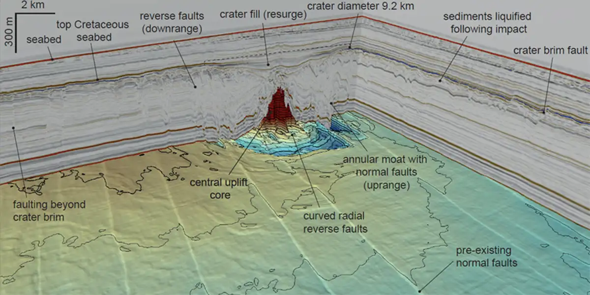После удара подводные осадочные породы буквально «поплыли», формируя характерный ободок кратера. Удар вызвал мощные землетрясения, которые разошлись по дну океана, породив разломы и цунами. Эти цунами могли разноситься по всей планете, приводя к ещё большему хаосу на суше и в океанах.