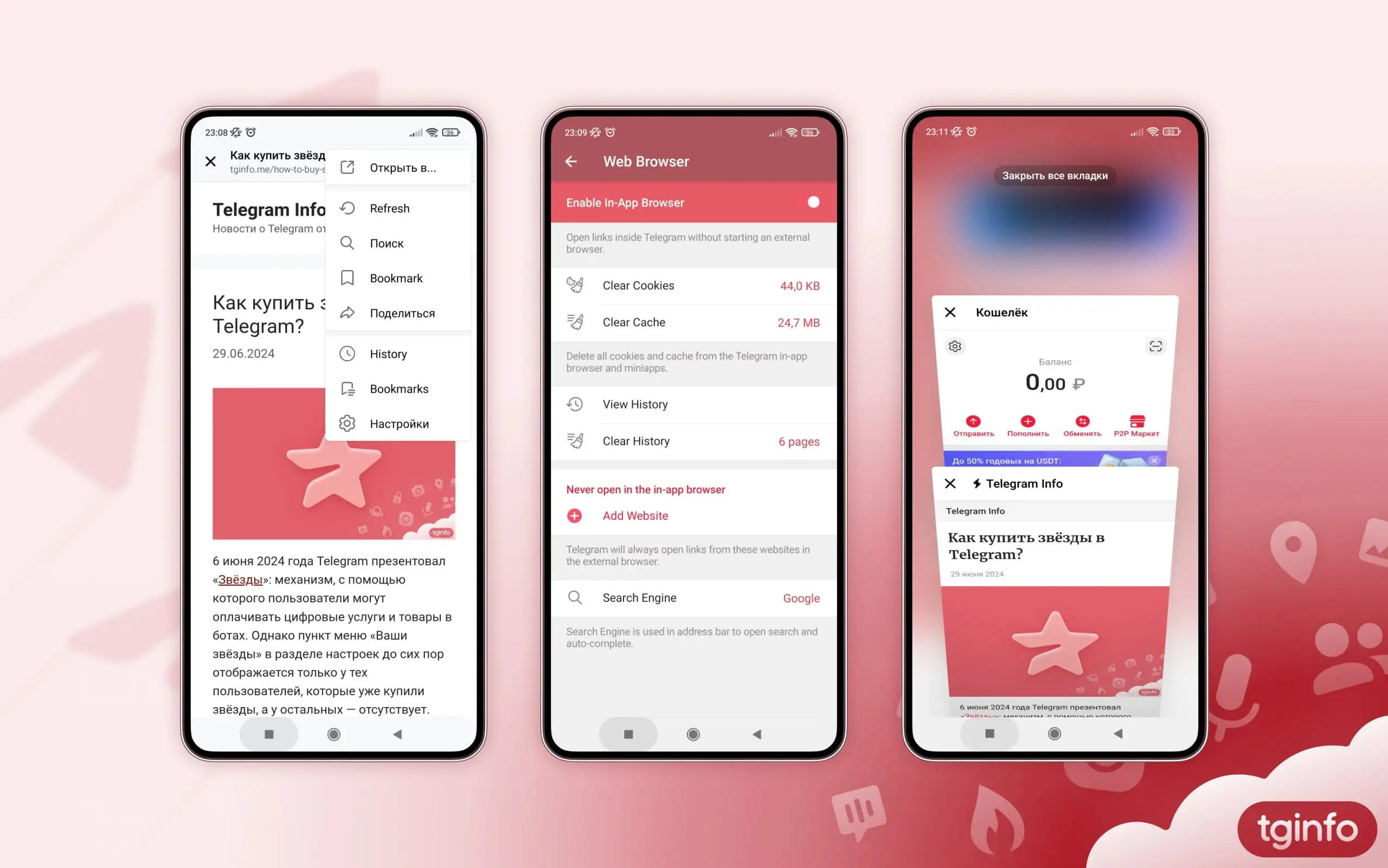 Обновлённый встроенный браузер Telegram также получил несколько значительных улучшений. Он теперь поддерживает открытие нескольких страниц одновременно и позволяет быстро переключаться между вкладками, что делает его использование более удобным для пользователей. Помимо этого, в браузере появилась возможность просматривать историю посещений, сохранять закладки, управлять кешем и файлами Cookie, а также менять поисковую систему. Эти изменения делают встроенный браузер более функциональным и приближают его по возможностям к отдельным браузерным приложениям.