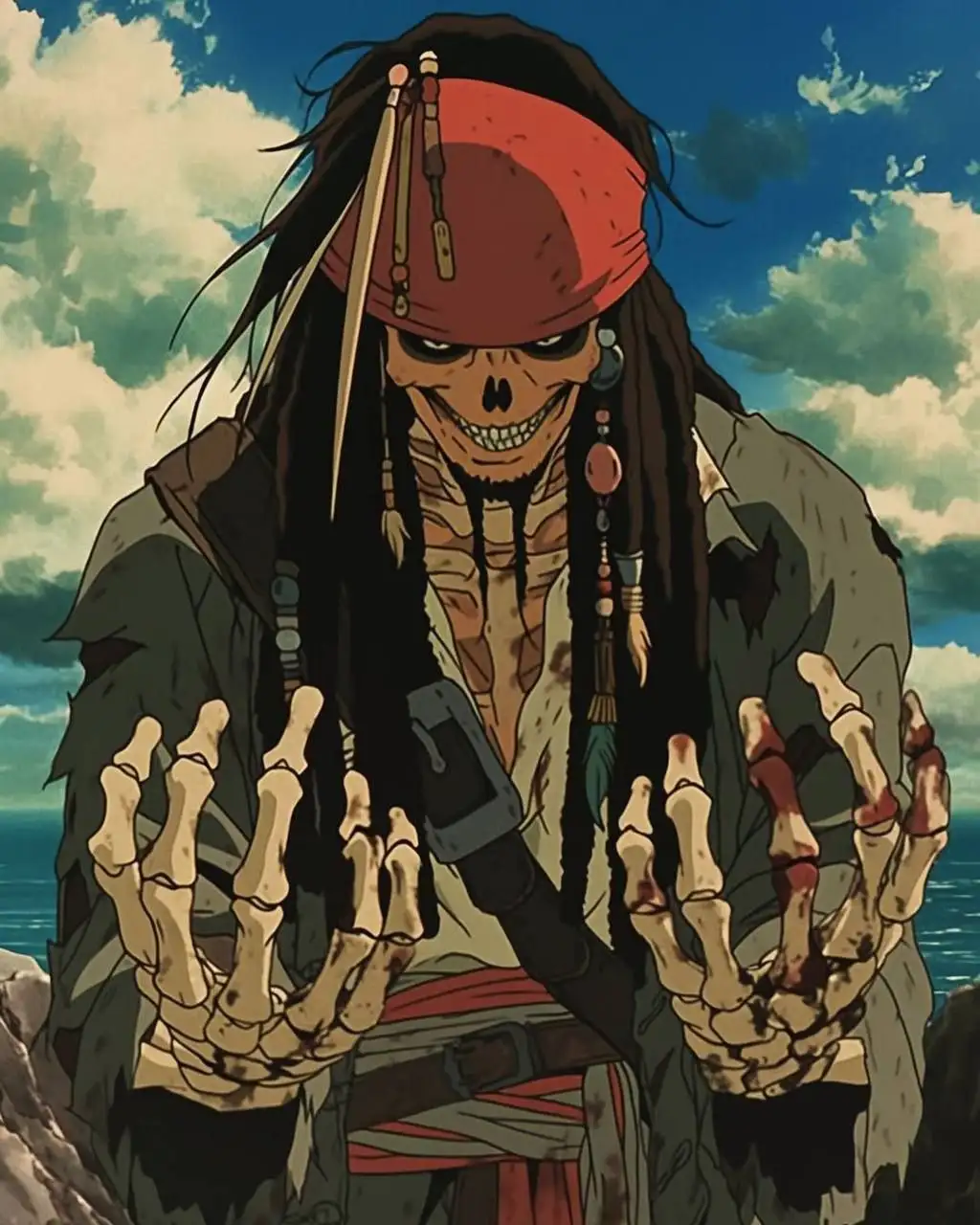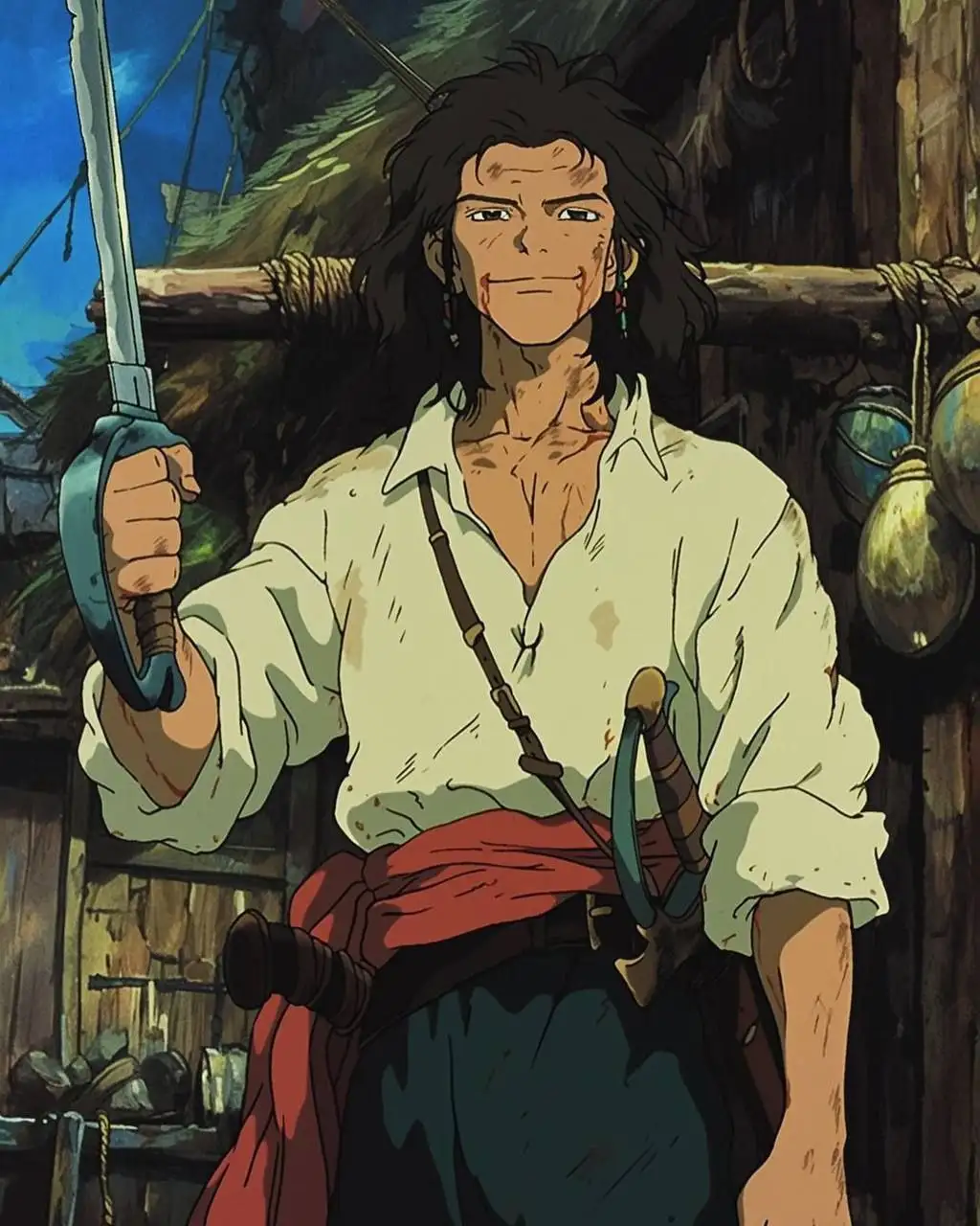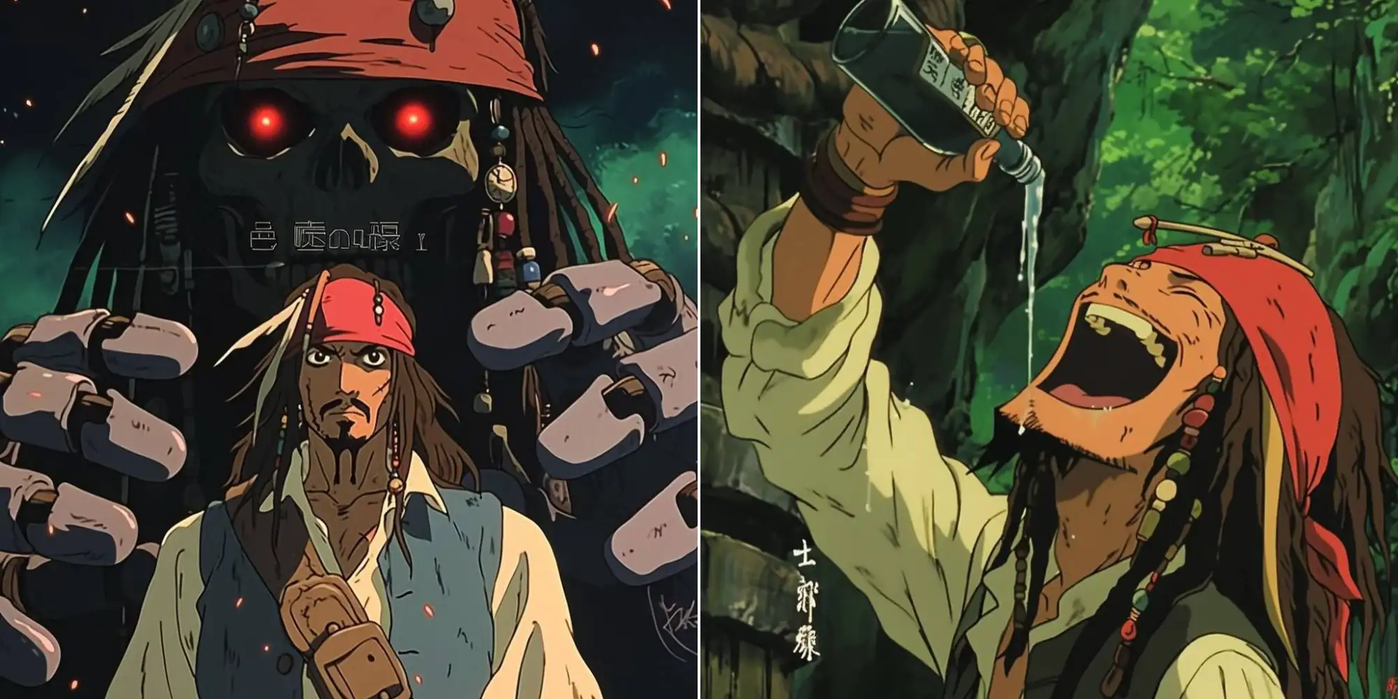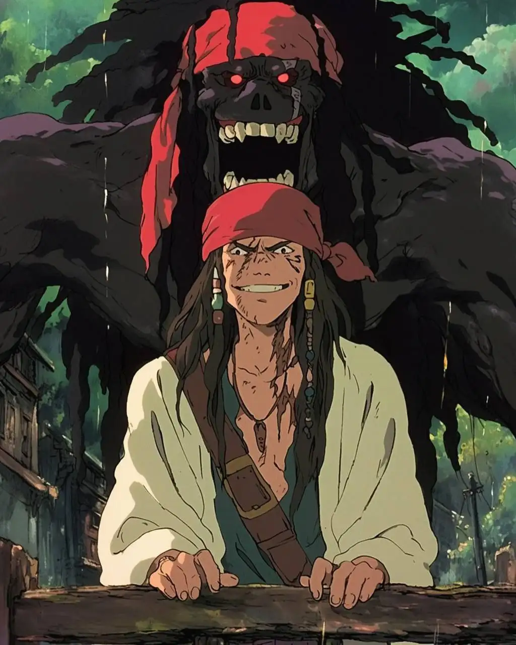 На первом кадре перед нами предстаёт Джек Воробей в своём привычном образе, но с аниме-оттенками. Его харизма и слегка безумный взгляд идеально сочетаются с мягкими линиями и пастельными цветами, присущими работам Ghibli.