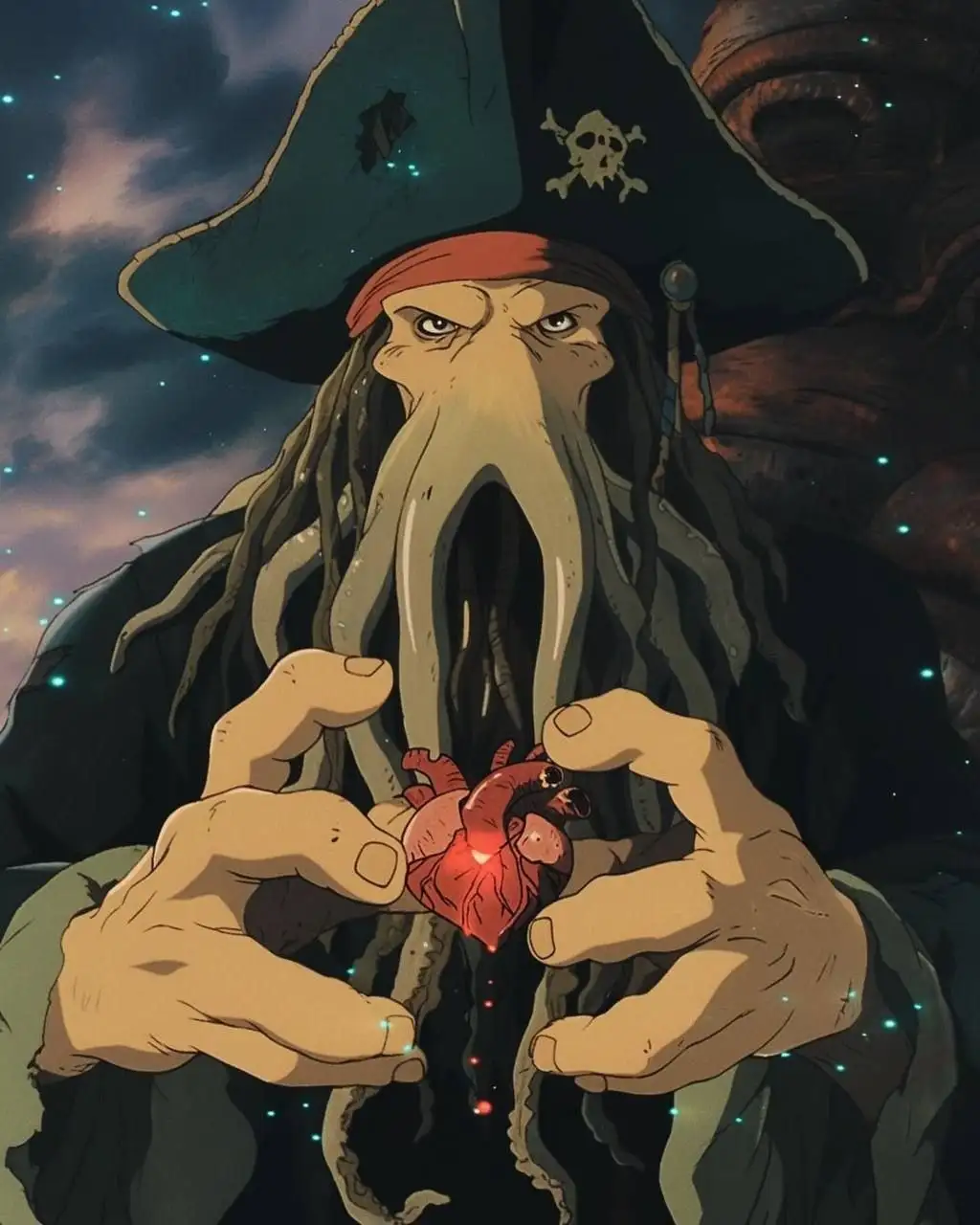 Дейви Джонс в стиле Ghibli — это отдельное произведение искусства. Его образ сочетает в себе ужасающую мощь и одновременно удивительную красоту.
