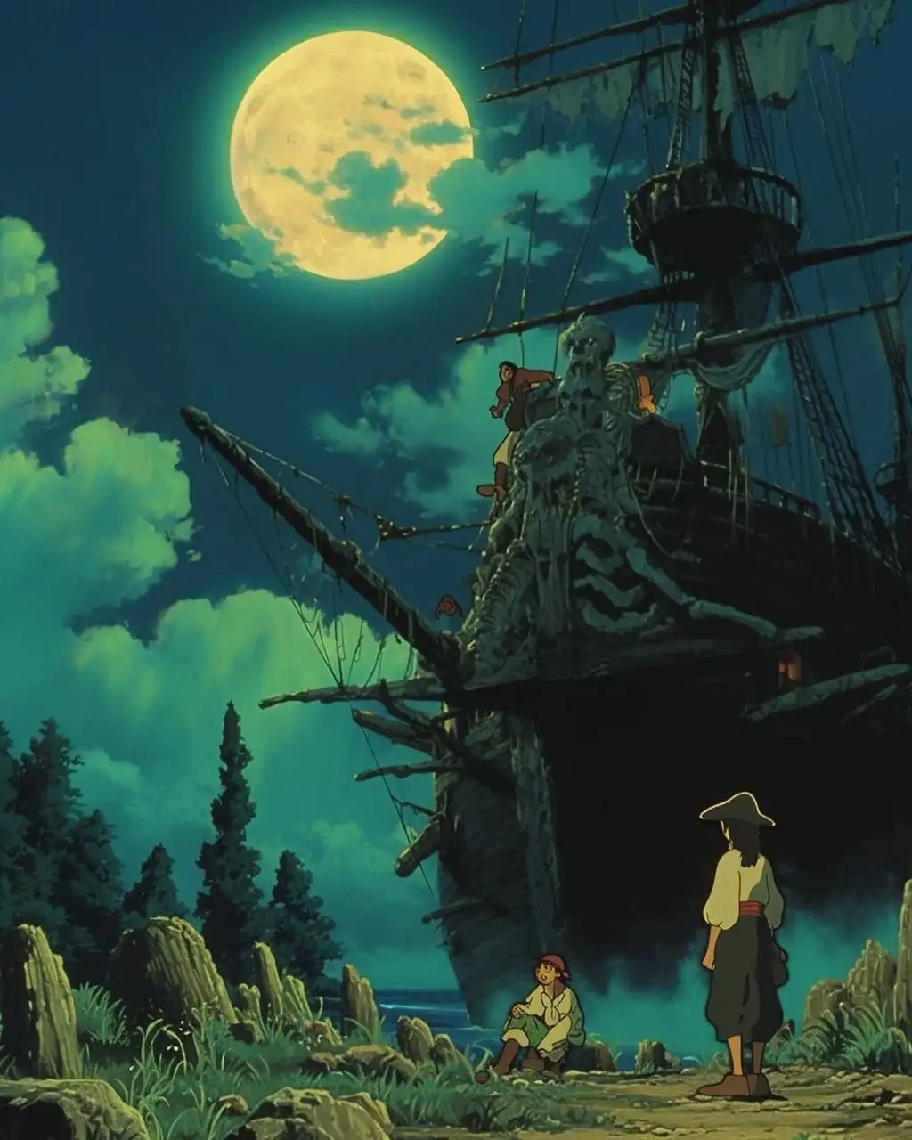 Конечно, куда же без Чёрной жемчужины? Этот легендарный корабль, выполненный в стиле Ghibli, выглядит как настоящая плавучая мечта. Он словно из другого мира, где сказка и реальность переплетаются воедино.