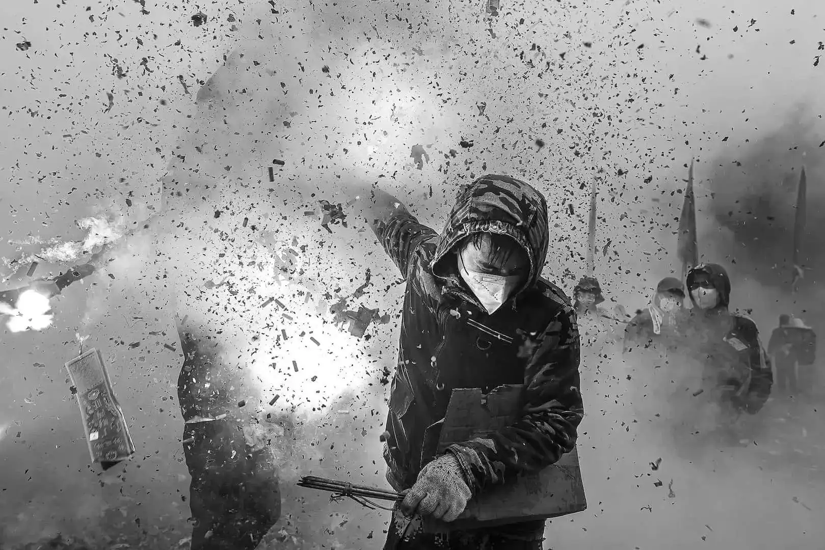 На фото запечатлён молодой человек в капюшоне и маске, взрывающий петарды, чтобы отогнать злых духов. Сильные контрасты и динамика кадра сделали его работу настоящим шедевром.